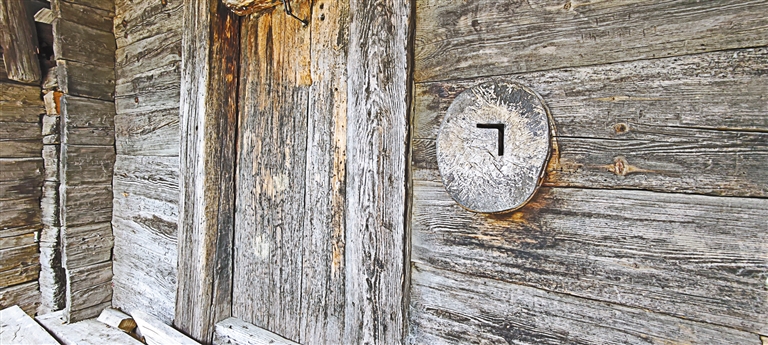 在村民的幫助下,我們依著鎖孔的形狀,將鑰匙平放進(jìn)去,沉進(jìn)鎖芯的孔道中,憑感覺挑起用小木塊做成的栓子,把沉重的木鎖從門邊的鎖洞中移除。接著,再用手伸進(jìn)鎖洞中摸索著移動房門后的木栓,即內(nèi)鎖,多次嘗試后終于打開了一間糧倉!