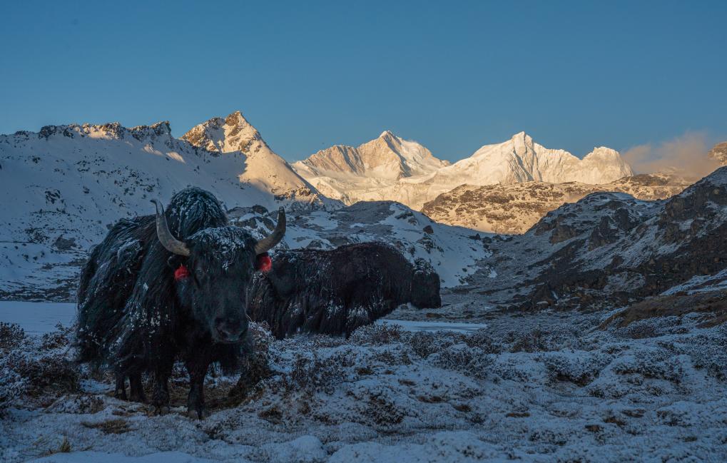 這是在嘎瑪溝中拍攝的牦牛和雪山(4月17日攝)。新華社記者 丁增尼達 攝