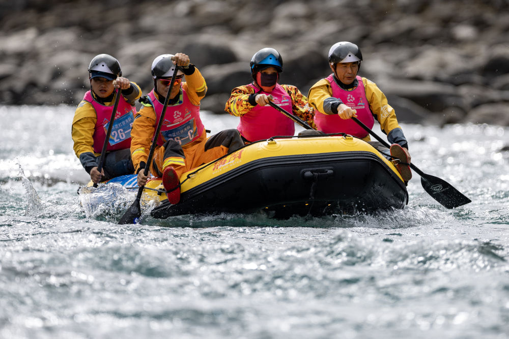 岑南琴(右二)在四人漂流艇拉力賽中。(4月21日攝)。新華社記者 姜帆 攝