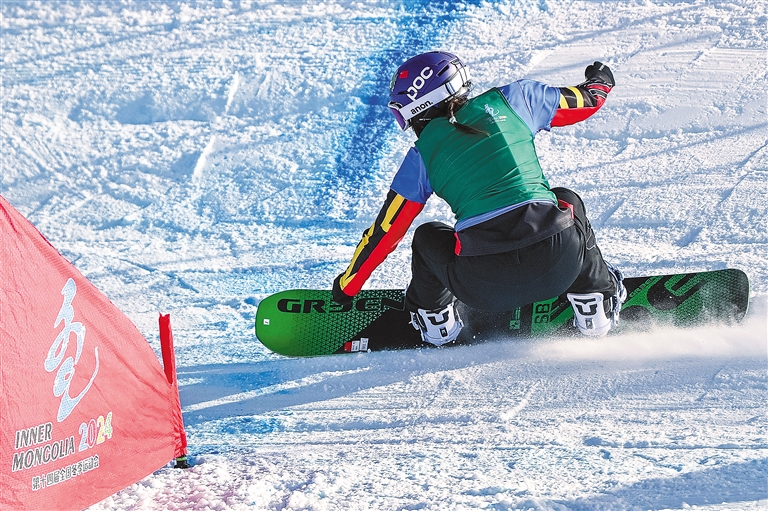 圖為2月19日,在內(nèi)蒙古烏蘭察布市涼城滑雪場舉行的第十四屆全國冬季運動會單板滑雪青年組女子障礙追逐賽中,中國西藏隊選手擁青拉姆正在比賽(資料圖片)。新華社記者 伍志尊 攝