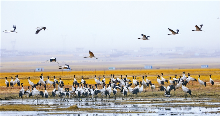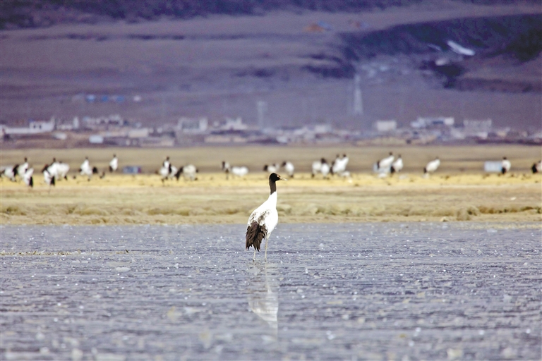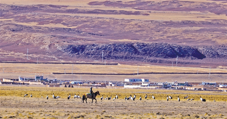 阿熱濕地內(nèi)黑頸鶴與人類(lèi)和諧相處。益西旦增 攝