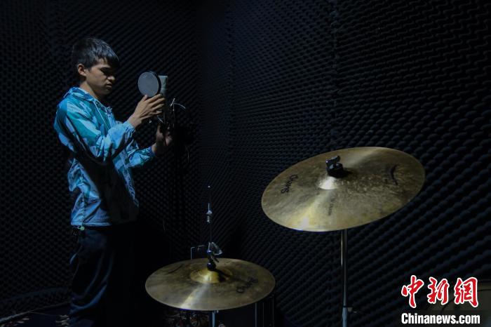 4月28日,尼瑪平措在公司的小錄音棚內(nèi)調(diào)整錄音設(shè)備,他們團(tuán)隊(duì)可以提供歌曲錄制服務(wù)。中新社記者 江飛波 攝