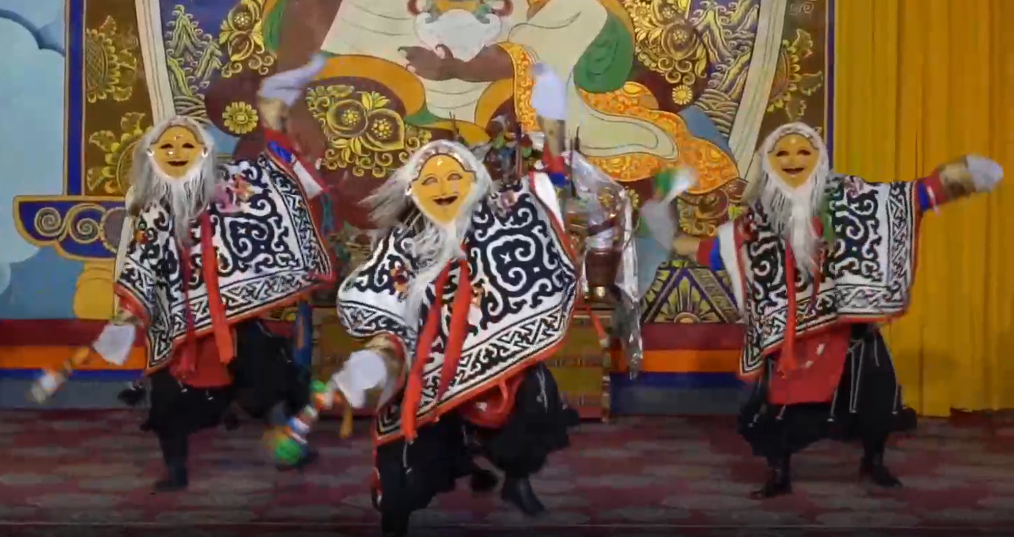 傳統(tǒng)藏戲的服裝從頭到尾只有一套,演員無需化妝,主要是戴面具表演。整體上看,藏戲分為白面具戲和藍(lán)面具戲。在同一臺藏戲中,又會出現(xiàn)紅、白、藍(lán)、黑、黃等不同顏色面具,代表不同身份?!氨热缢{(lán)色面具代表獵人,黃色面具代表高僧、官員等?!蹦岈敶稳收f。以戴黃色面具為主的扎西雪巴是白面具藏戲的杰出代表。