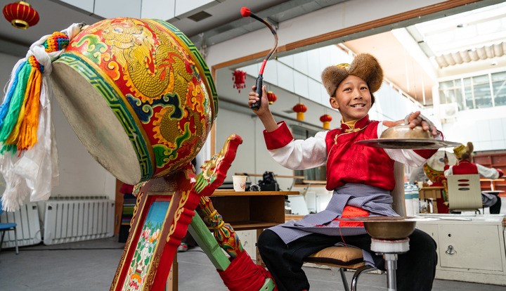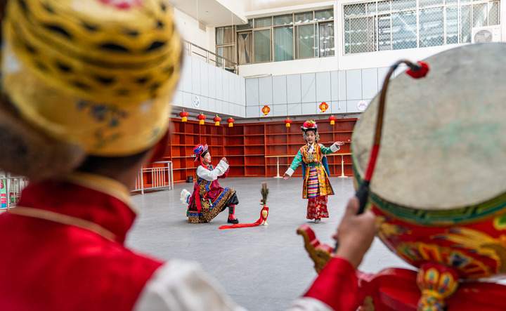 藏戲小演員為表演伴奏。新華社記者 丁增尼達(dá) 攝