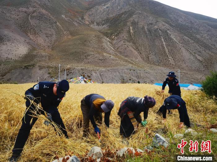圖為貢當邊境派出所民警幫助當?shù)剞r民秋收。日喀則邊境管理支隊供圖