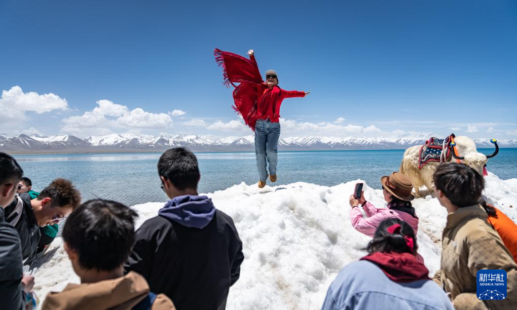 5月19日,游客在納木錯旁拍照留念。新華社記者 丁增尼達 攝