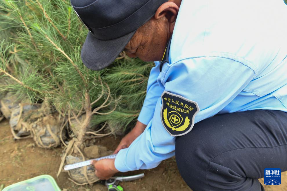 6月3日,在拉薩南北山綠化工程2024年度鞏固提升(貢嘎機(jī)場(chǎng)周邊山體)工程項(xiàng)目上,林業(yè)檢疫執(zhí)法工作人員在檢查樹苗根部土球是否達(dá)標(biāo)。新華社記者 晉美多吉 攝