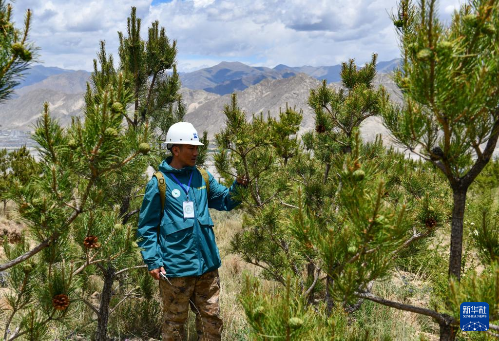6月3日,拉薩南北山綠化工程2024年度鞏固提升(貢嘎機(jī)場(chǎng)周邊山體)工程項(xiàng)目上,第三方監(jiān)理人員在檢查樹木狀況。新華社記者 晉美多吉 攝