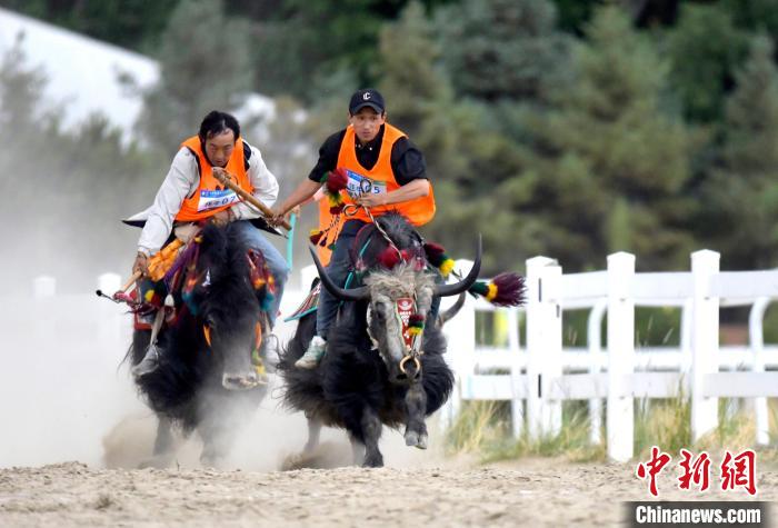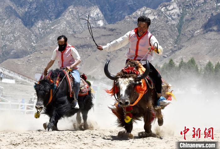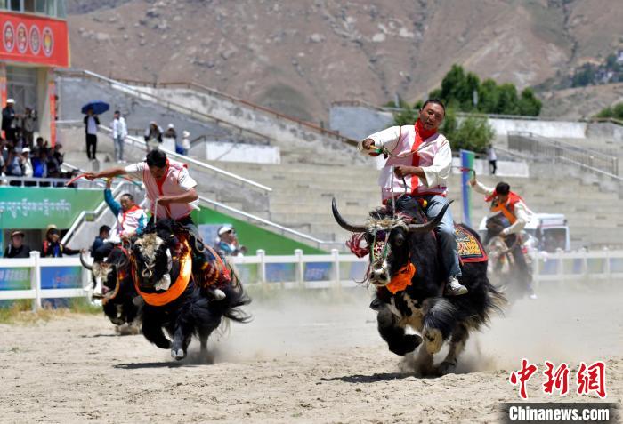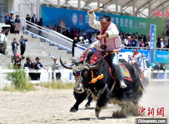 牦牛被譽為“高原之舟”,賽牦牛是藏族的傳統(tǒng)體育項目。6月23日,拉薩首屆農牧民運動會上的賽牦牛比賽,騎手們驅牛疾馳。圖為賽牦牛決賽比賽現場。中新社記者 李林 攝