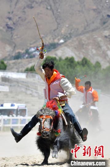 牦牛被譽為“高原之舟”,賽牦牛是藏族的傳統(tǒng)體育項目。6月23日,拉薩首屆農牧民運動會上的賽牦牛比賽,騎手們驅牛疾馳。圖為賽牦牛預賽比賽現場。中新社記者 李林 攝