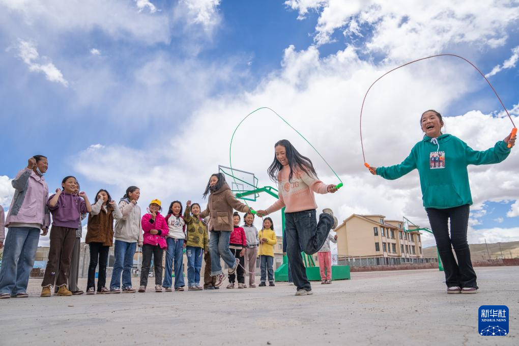 班戈縣中石化小學學生尼瑪措姆(右二)和同學們在操場上跳繩(6月22日攝)。新華社記者 丁增尼達 攝