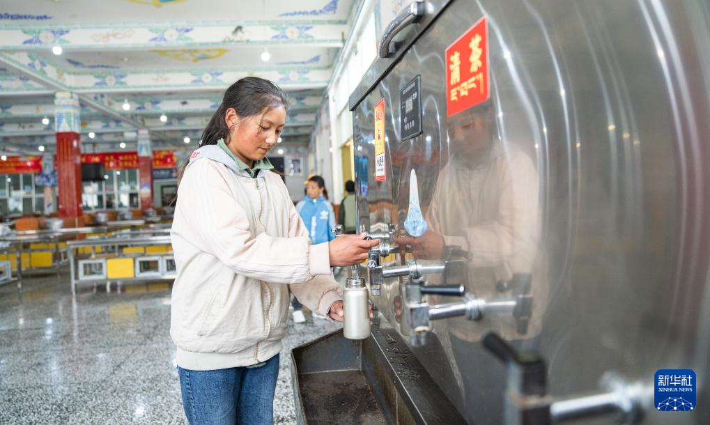 班戈縣中石化小學學生旺青拉姆用水杯接清茶(6月22日攝)。新華社記者 丁增尼達 攝