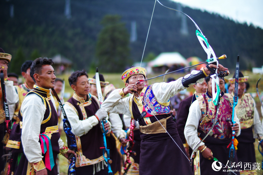 工布牧歌旅游文化節(jié)上,當(dāng)?shù)卮迕裾趨⒓由浼荣?。人民日?bào)記者 瓊達(dá)卓嘎攝