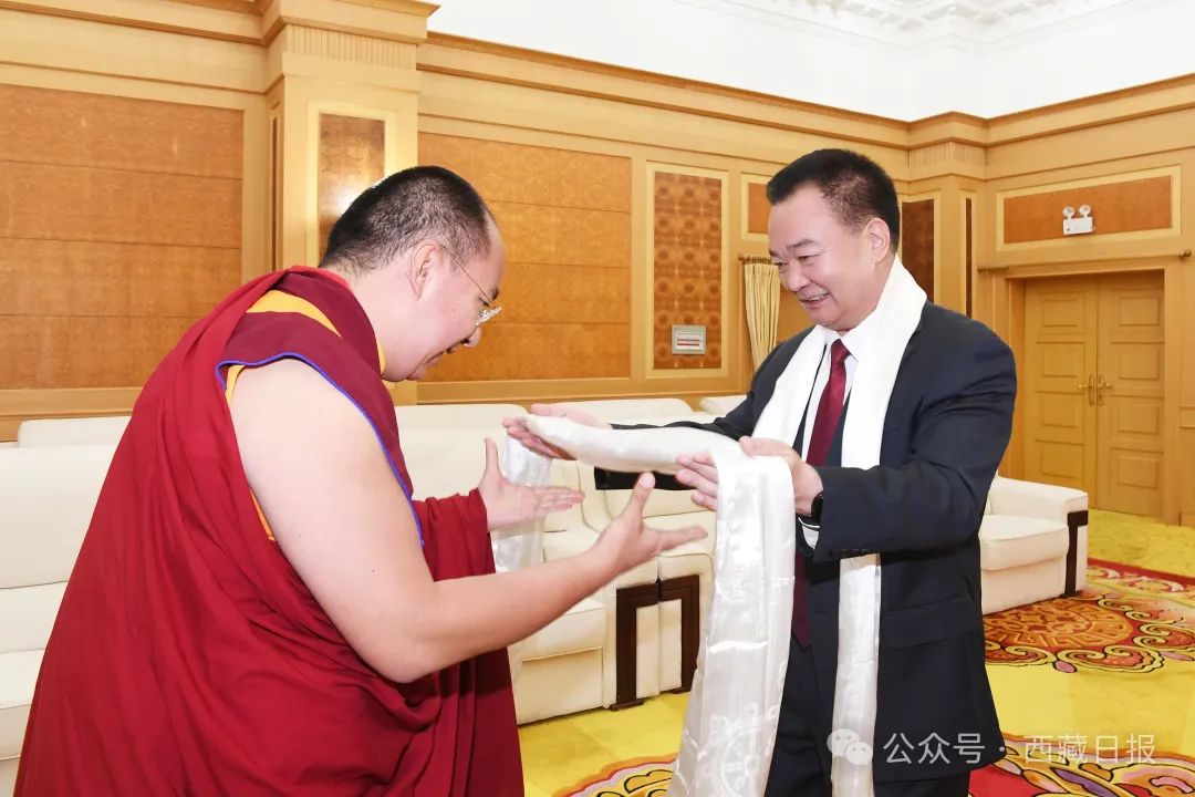 6月26日下午,自治區(qū)黨委書(shū)記王君正在拉薩會(huì)見(jiàn)班禪額爾德尼·確吉杰布。這是王君正與班禪額爾德尼·確吉杰布互獻(xiàn)哈達(dá)。記者 李洲 攝