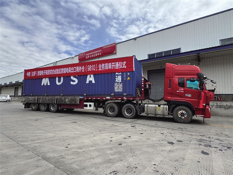 陽(yáng)光透過云層,灑在堆龍德慶區(qū)城投物流園區(qū)寬廣的場(chǎng)地上,兩輛載有藍(lán)色集裝箱的卡車??吭谖锪鱾}(cāng)前,十分引人注目。這是中國(guó)(拉薩)跨境電子商務(wù)綜合試驗(yàn)區(qū)跨境電商出口海外倉(cāng)“9810”業(yè)務(wù)首單,它們將跨越喜馬拉雅山,將滿載的服裝百貨、家用電器等商品送往尼泊爾加德滿都市的海外倉(cāng)。