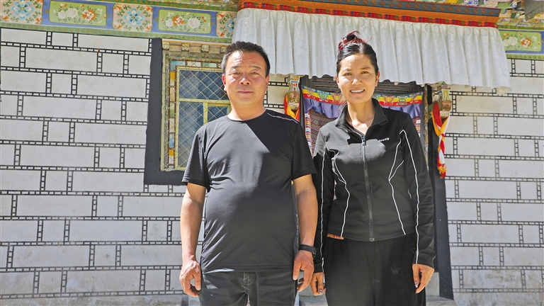 謝軍成達(dá)娃卓嘎夫婦在自家新房門(mén)前合影。