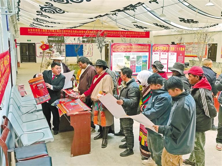 那曲市雙湖縣措折羅瑪鎮(zhèn)第三屆“鄉(xiāng)村振興 那曲奮進(jìn)”活動中,法庭干警(左一)向群眾進(jìn)行普法宣傳。