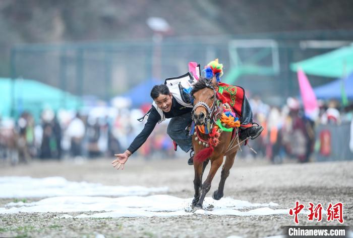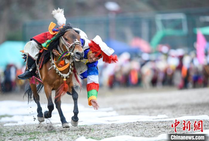 7月21日,西藏自治區(qū)拉薩市堆龍德慶區(qū)馬鎮(zhèn)朗巴村民眾賽馬歡度“望果節(jié)”?!巴?jié)”民俗已有1500多年的歷史,是國家級(jí)非物質(zhì)文化遺產(chǎn)。圖為騎手進(jìn)行馬術(shù)表演。中新社記者 貢嘎來松 攝