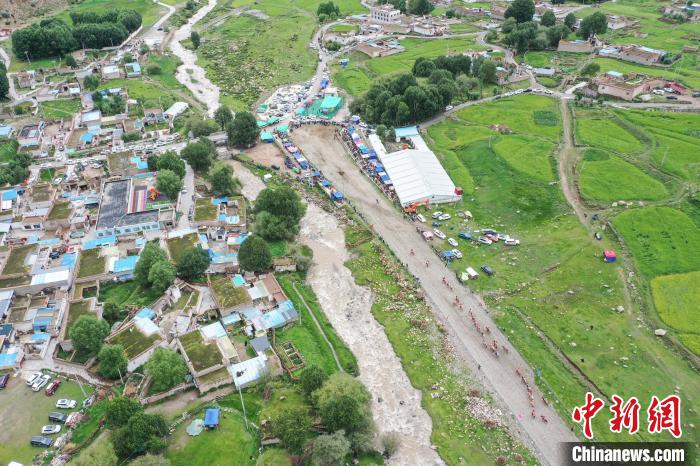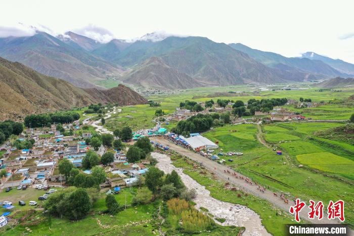 7月21日,西藏自治區(qū)拉薩市堆龍德慶區(qū)馬鎮(zhèn)朗巴村民眾賽馬歡度“望果節(jié)”?!巴?jié)”民俗已有1500多年的歷史,是國家級(jí)非物質(zhì)文化遺產(chǎn)。圖為賽馬比賽現(xiàn)場。(無人機(jī)照片)中新社記者 貢嘎來松 攝