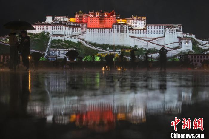 西藏布達拉宮是世界文化遺產(chǎn),入夏后,布達拉宮廣場音樂噴泉每晚準時響起,景觀燈準時照亮,宜人夜色吸引市民、游客前來觀景。圖為7月24日晚,拉薩迎來降雨,游客、攝影師等在廣場駐足,拍攝雨中的布達拉宮。中新社記者 江飛波 攝