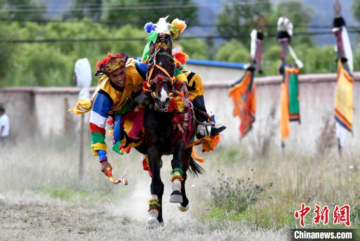 7月27日,西藏拉薩市桑達(dá)村迎來“望果節(jié)”,村民們舉行賽馬活動(dòng)慶祝?!巴?jié)”是西藏傳統(tǒng)的豐收節(jié),具體日期隨各地莊稼成熟的時(shí)間而變化。“望果節(jié)”期間,按照習(xí)俗,各地都會(huì)舉辦賽馬比賽。圖為騎手進(jìn)行馬術(shù)表演。中新社記者 李林 攝