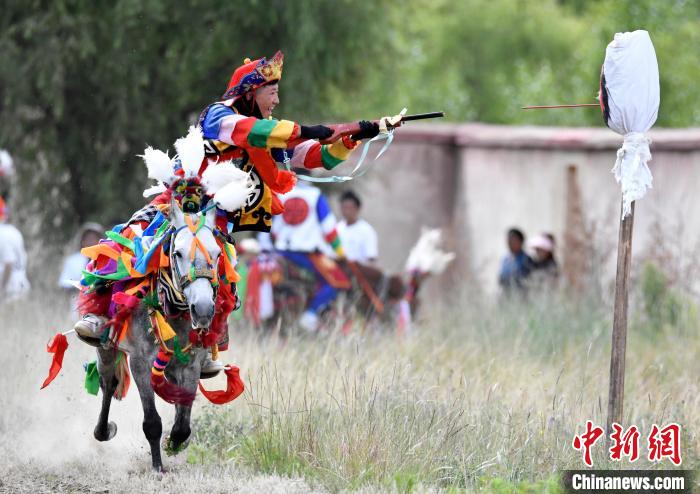 7月27日,西藏拉薩市桑達(dá)村迎來“望果節(jié)”,村民們舉行賽馬活動(dòng)慶祝。“望果節(jié)”是西藏傳統(tǒng)的豐收節(jié),具體日期隨各地莊稼成熟的時(shí)間而變化。“望果節(jié)”期間,按照習(xí)俗,各地都會(huì)舉辦賽馬比賽。圖為騎手進(jìn)行馬上射擊表演。中新社記者 李林 攝