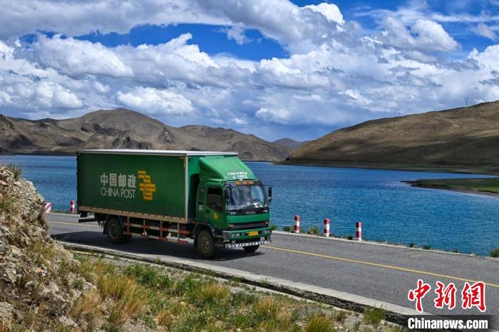 6月21日,一輛郵件運輸車輛行駛在高原湖畔。(西藏自治區(qū)郵政管理局 供圖)