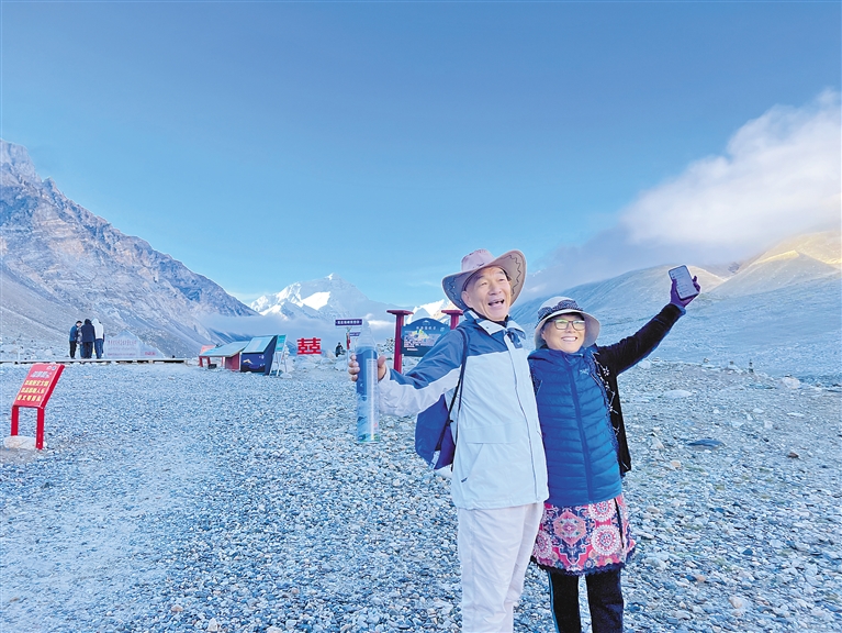 游客在羊卓雍錯(cuò)拍照留念。記者 張麗萍 攝