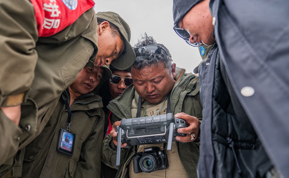 2024年5月10日,在西藏羌塘國家級自然保護區(qū),羅布玉杰管護站站長格桑倫珠(右二)和隊員們在大雪中操作無人機觀察藏羚羊遷徙情況。
