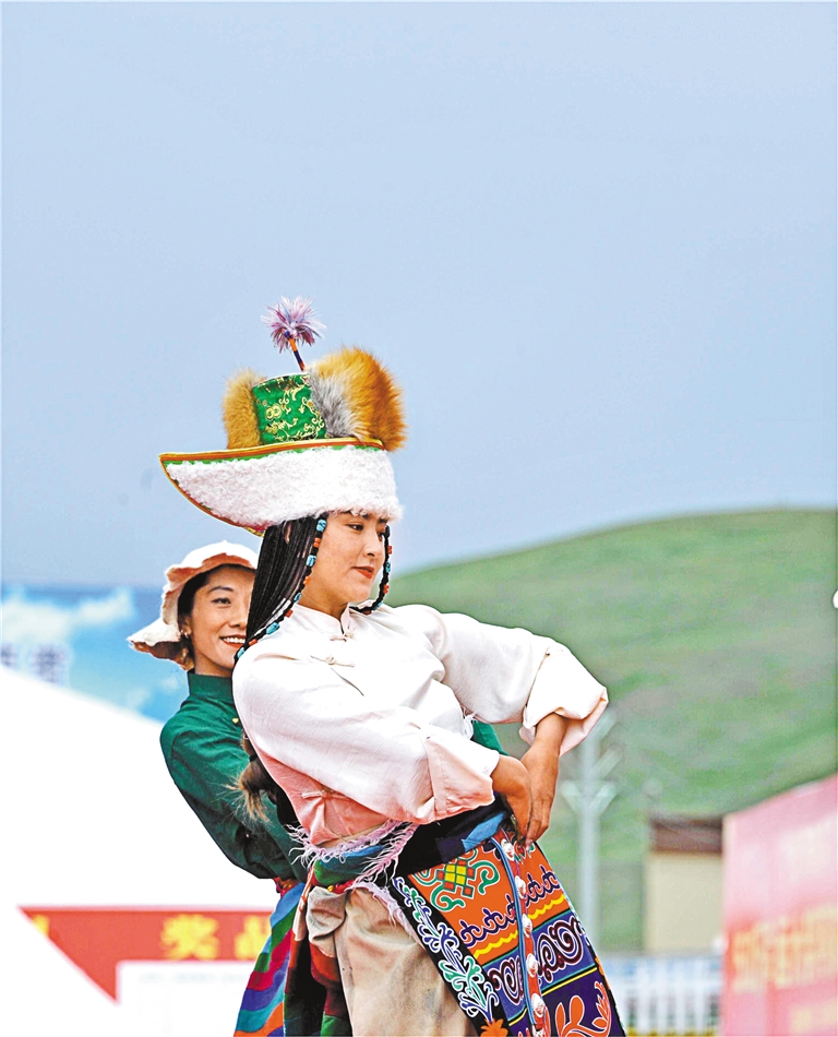 圖為班戈縣群眾在那曲市11縣區(qū)文藝調(diào)演比賽中表演舞蹈。