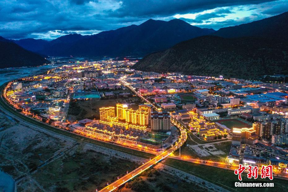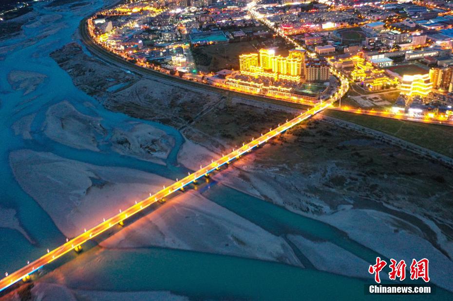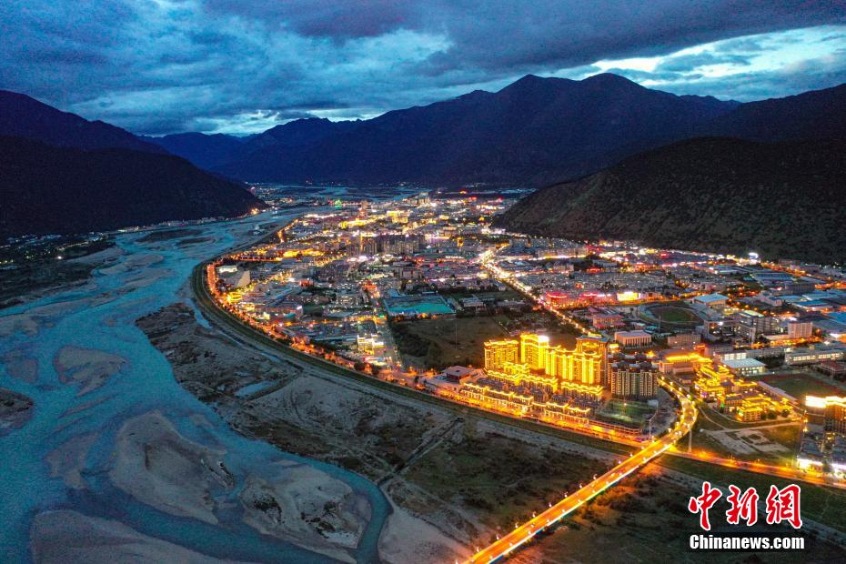 8月22日晚,西藏林芝市城市夜景美,城市建筑、橋體的燈光與尼洋河相映成趣,景色美麗。(無(wú)人機(jī)照片)中新社記者 貢嘎來松 攝