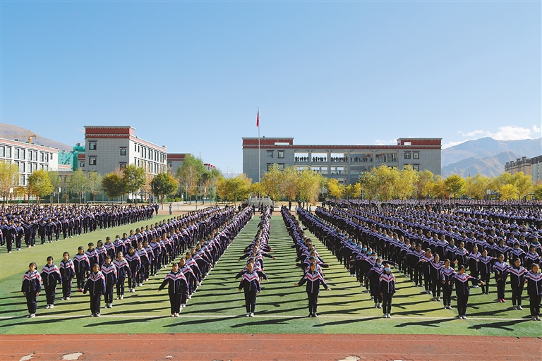 圖為拉薩實(shí)驗(yàn)中學(xué)的學(xué)生在做課間操。(圖片由江蘇援藏指揮部提供)