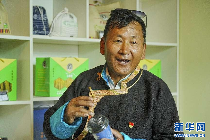 圖為申藏村黨支部書(shū)記旺扎在介紹新產(chǎn)品(9月2日攝)。新華網(wǎng)發(fā) 喬柯嵐攝