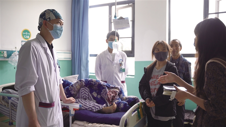 天津市第十批援藏干部、昌都市藏醫(yī)院外科行政副主任陳陽(yáng)(左一)正在查房。