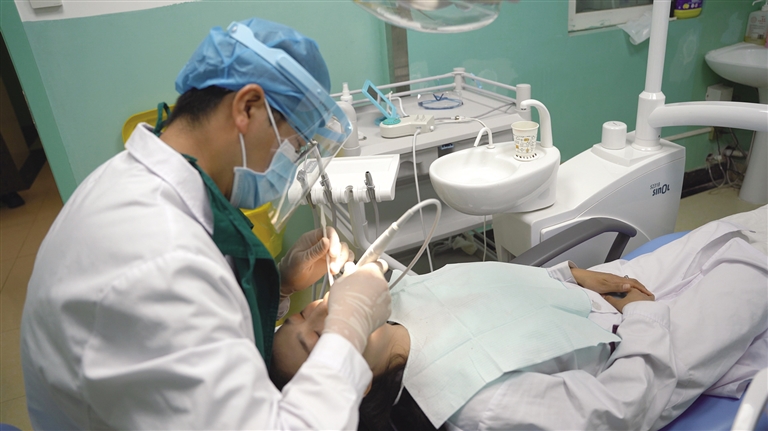 天津市第十批援藏干部、昌都市藏醫(yī)院口腔科副主任醫(yī)師杜斌正在對(duì)患者開(kāi)展口腔治療。