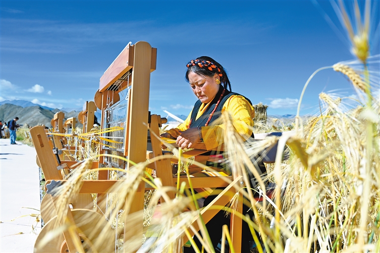 萬(wàn)里晴空下,金色青稞隨風(fēng)搖曳,靜等豐收的季節(jié);希望的田地上,在傳承和創(chuàng)新中,千年氆氌再現(xiàn)輝煌。