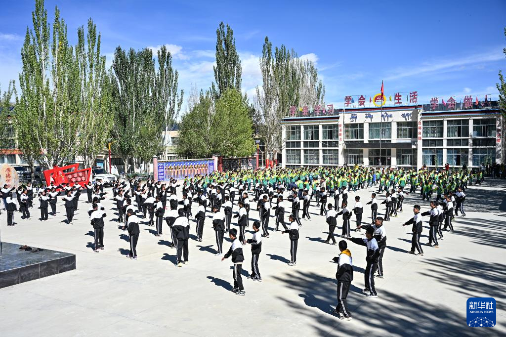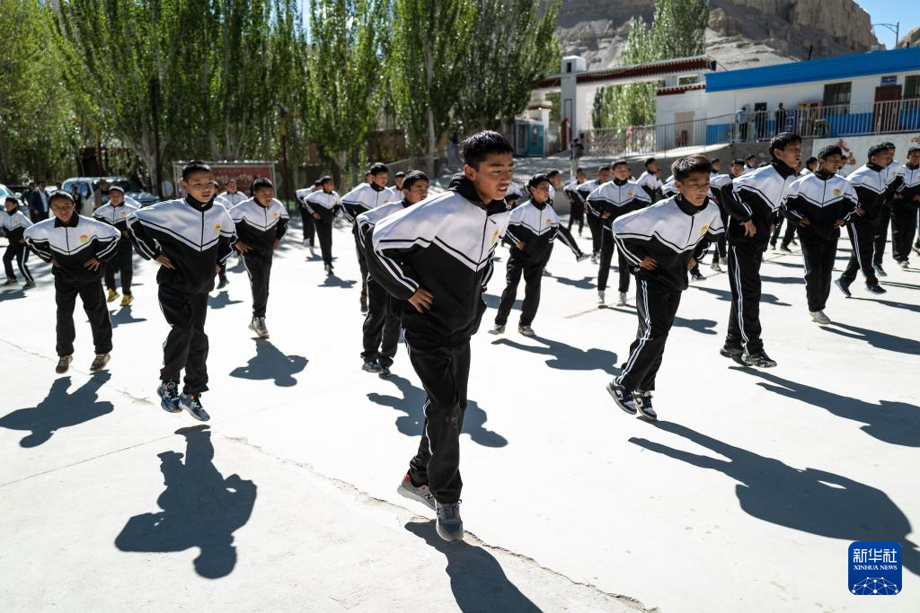 在西藏阿里地區(qū)札達(dá)縣九年一貫制學(xué)校,孩子們跳起融入國家級(jí)非物質(zhì)文化遺產(chǎn)“宣舞”特色的課間操(9月10日攝)。新華社記者 孫瑞博 攝