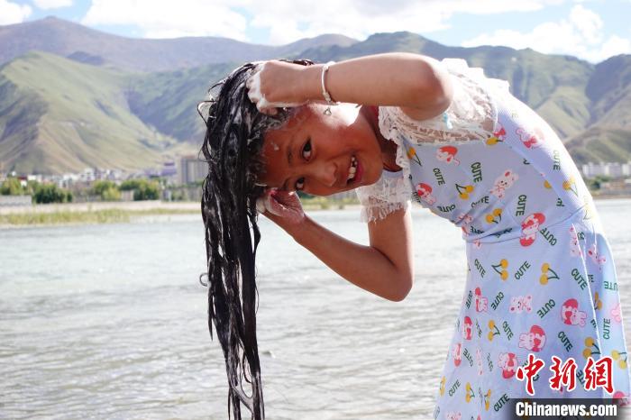 不少兒童在大人的看護(hù)下嬉戲玩水,9歲的強(qiáng)久措姆說:“我覺得在河邊洗澡特別有趣,能夠更好地親近大自然,還可以過林卡?!?/p>
