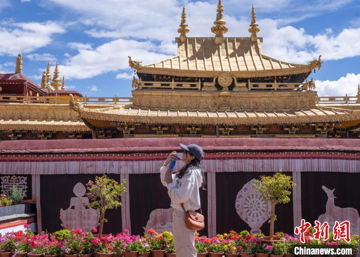 9月17日,游客在西藏拉薩大昭寺金頂前留影。中秋佳節(jié),距今已有1300多年歷史、2000年作為布達(dá)拉宮擴(kuò)展項目列入《世界遺產(chǎn)名錄》的拉薩大昭寺迎來眾多游客。中新社記者 貢嘎來松 攝