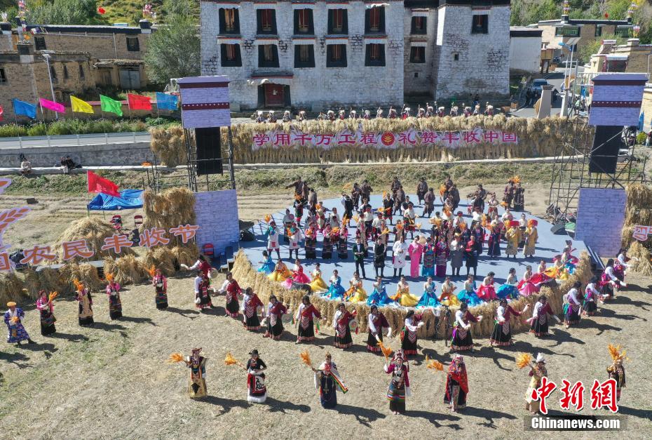 9月22日,2024年西藏“中國農(nóng)民豐收節(jié)”慶祝活動在山南市瓊結縣拉玉鄉(xiāng)強吉村舉行。活動以“學用‘千萬工程’禮贊豐收中國”為主題,由西藏各地(市)民間演出隊為大家獻上一場具有地域特色、體現(xiàn)農(nóng)牧民豐收喜悅的歌舞盛宴。圖為演出現(xiàn)場。(無人機照片)