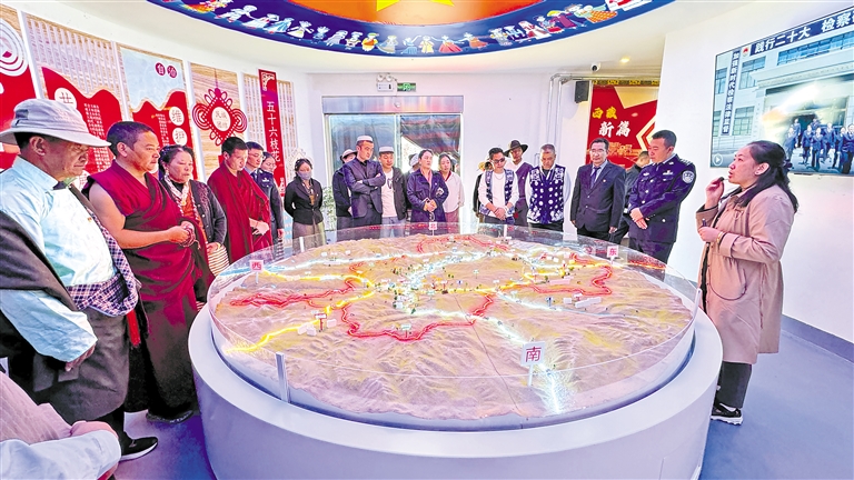 9月14日,拉孜縣曲下鎮(zhèn)以鑄牢中華民族共同體意識為主線,舉辦首屆“格?;ㄩ_石榴紅·凝心鑄魂新征程”運動會暨“迎中秋、慶團結”茶話會。 圖為各民族群眾代表參觀拉孜縣鑄牢中華民族共同體意識教育館。