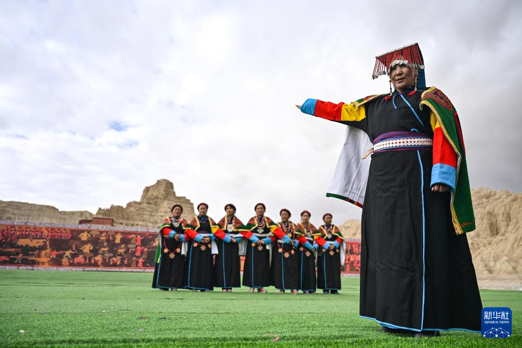 在西藏阿里地區(qū)札達(dá)縣古格王國遺址腳下,自治區(qū)級“宣舞”非遺傳承人央金(右)介紹“宣舞”(9月11日攝)。新華社記者 孫瑞博 攝
