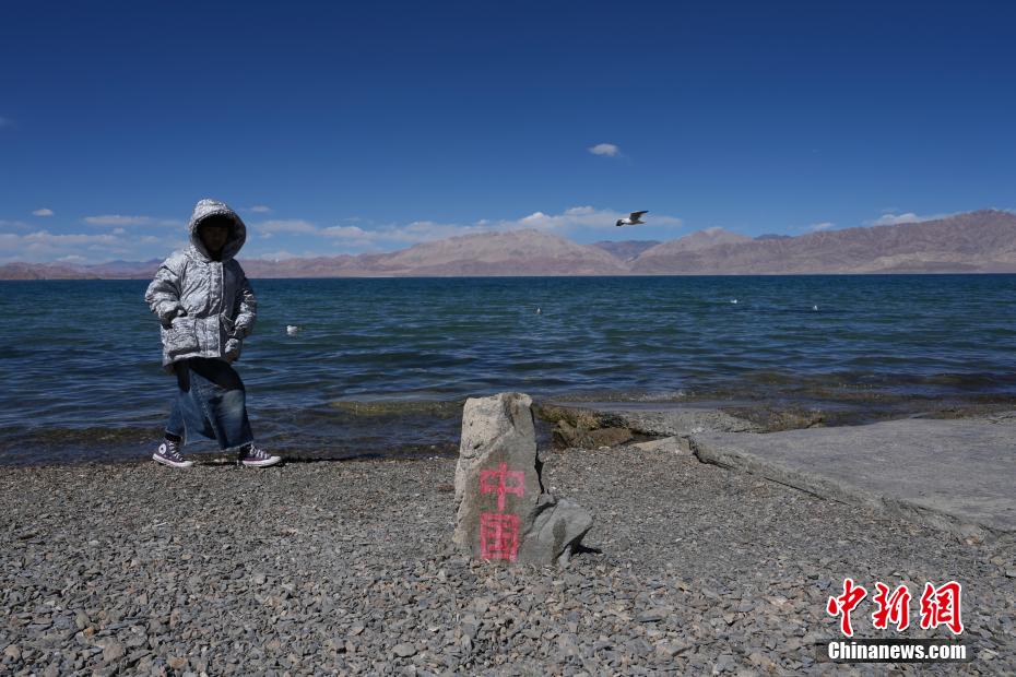 10月4日,一名小游客經(jīng)過(guò)班公湖畔的“中國(guó)”石碑?!笆弧眹?guó)慶假期,西藏日土縣班公湖吸引不少游客觀光游覽。中新社記者 崔楠 攝