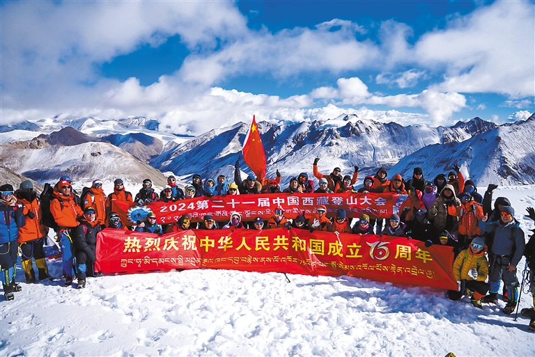 此時(shí),倘若從山腳往上看,與雄偉圣潔的雪山相比,緩緩行進(jìn)的登山者們是如此渺小,又如此頑強(qiáng)?!皼]有比人更高的山,沒有比腳更長的路?!痹陬B強(qiáng)意志的支撐下,在向?qū)У膸椭?,在挑?zhàn)中不斷超越自我,最終,絕大部分山友沖頂成功,齊聚海拔6010米的洛堆峰頂,以實(shí)際行動(dòng)慶祝中華人民共和國成立75周年。大家或在洛堆峰紀(jì)念碑前拍照打卡,或組織團(tuán)隊(duì)成員拿出提前準(zhǔn)備好的橫幅道具拍攝視頻,表達(dá)對(duì)祖國或者家人的祝福,登頂成功的喜悅洋溢在洛堆峰頂稀薄的空氣中。