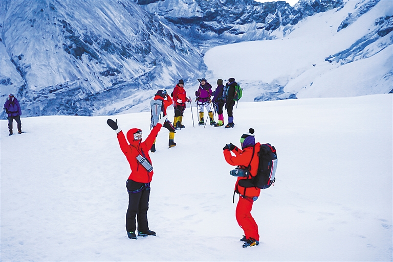 登頂成功的登山愛好者在洛堆峰頂合影留念。