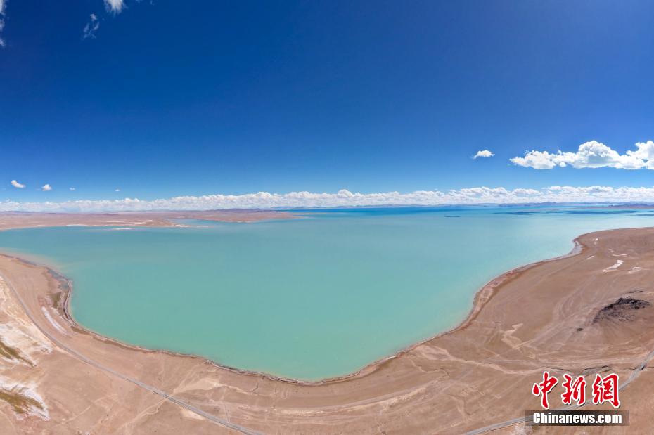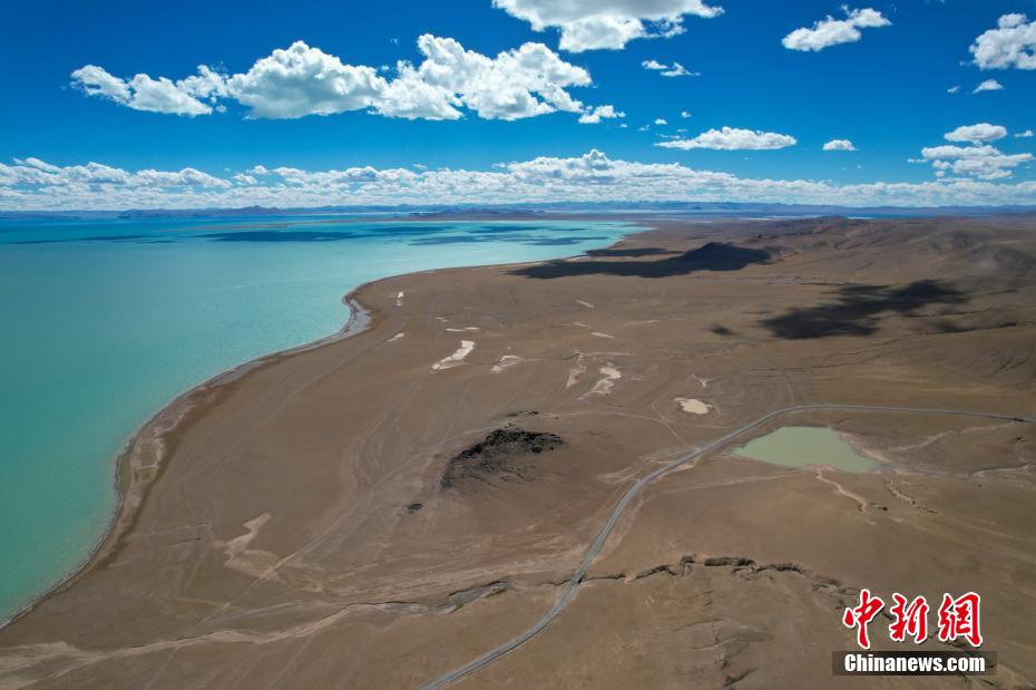 國(guó)慶期間,中新網(wǎng)記者自駕西藏藏北羌塘草原,途經(jīng)“天湖”納木錯(cuò),高原鹽湖班戈湖以及西藏第一大湖色林錯(cuò)等地。秋天高原藍(lán)天白云的映襯下,藏北湖泊猶如一面面巨大的“寶石藍(lán)”鏡子鑲嵌于高原大地,景色壯麗。圖為10月2日,航拍西藏第一大湖色林錯(cuò)北岸風(fēng)光。記者 江飛波 攝