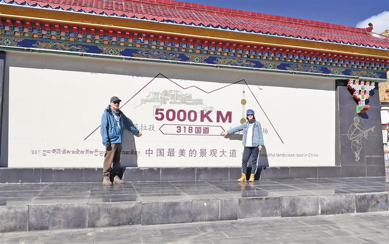 圖為游客在日喀則市拉孜上海人民廣場合影留念。記者 王敏 攝
