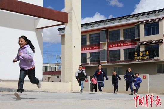 9月14日,西藏那曲市班戈縣第二(中石化)小學,學生們課間休息時在戶外玩耍。中青報·中青網(wǎng)記者 孔斯琪/攝