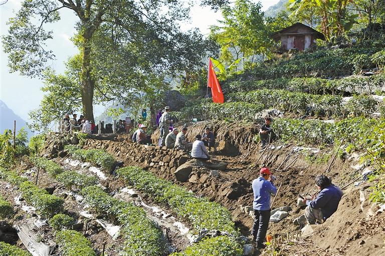 墨脫縣德興村茶果園內(nèi),工作人員正在護(hù)理樹苗。 記者王珊 謝筱純 攝