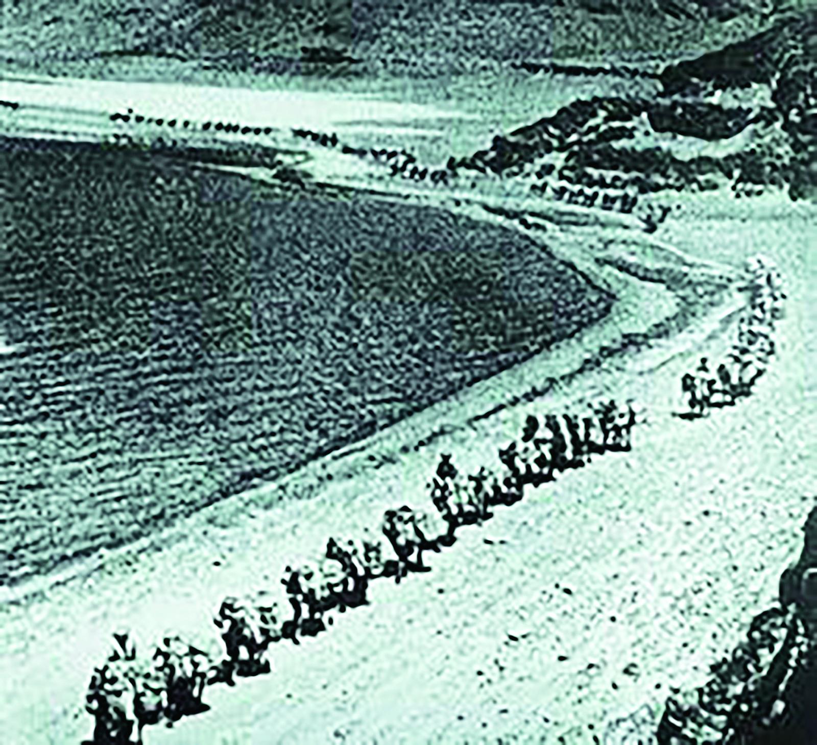 1954年4月,慕生忠宣布,筑路工程隊正式成立。工程隊下設(shè)2個測量隊、6個施工隊和1個后勤保障單位。隨后,筑路大軍帶著帳篷,牽著駱駝,用大錘鐵鍬叩響了天路之門。